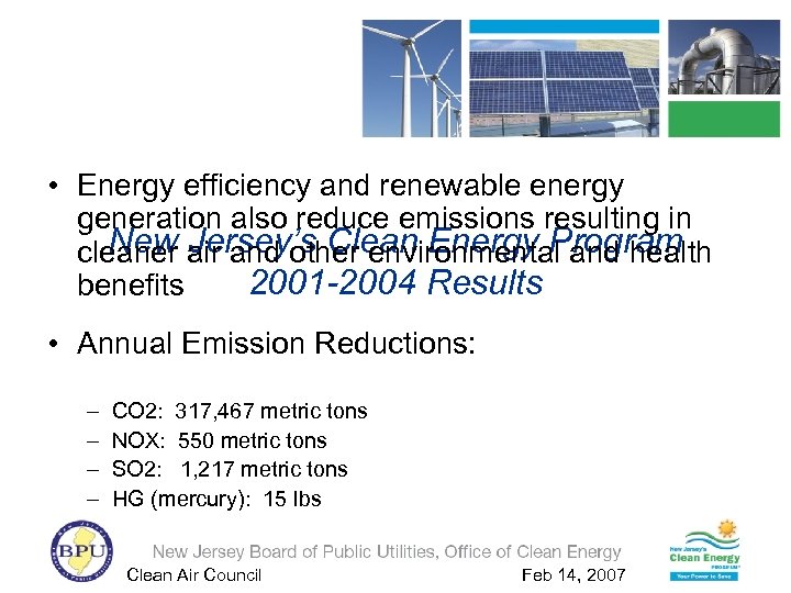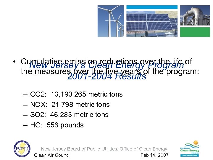 • Cumulative emission reductions over the life of New Jersey’s Clean Energy Program the measures over the five years of the program: 2001 -2004 Results – – CO 2: 13, 190, 265 metric tons NOX: 21, 798 metric tons SO 2: 46, 283 metric tons HG: 558 pounds Clean Air Council Feb 14, 2007