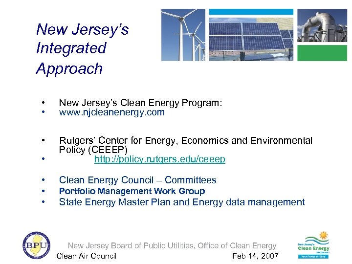 New Jersey’s Integrated Approach • • New Jersey’s Clean Energy Program: www. njcleanenergy. com • • Rutgers’ Center for Energy, Economics and Environmental Policy (CEEEP) http: //policy. rutgers. edu/ceeep • Clean Energy Council – Committees • Portfolio Management Work Group • State Energy Master Plan and Energy data management Clean Air Council Feb 14, 2007