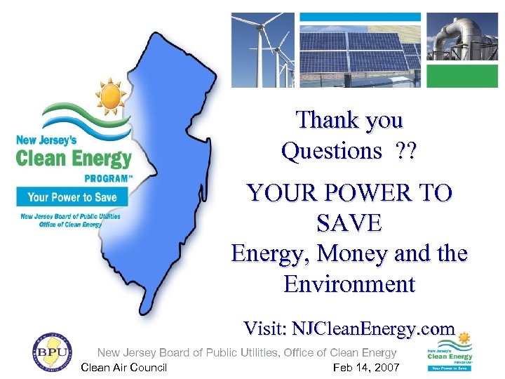 Thank you Questions ? ? YOUR POWER TO SAVE Energy, Money and the Environment Visit: NJClean. Energy. com Clean Air Council Feb 14, 2007