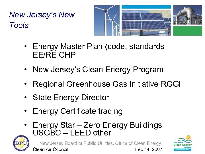 New Jersey’s New Tools • Energy Master Plan (code, standards EE/RE CHP • New Jersey’s Clean Energy Program • Regional Greenhouse Gas Initiative RGGI • State Energy Director • Energy Certificate trading • Energy Star – Zero Energy Buildings USGBC – LEED other Clean Air Council Feb 14, 2007