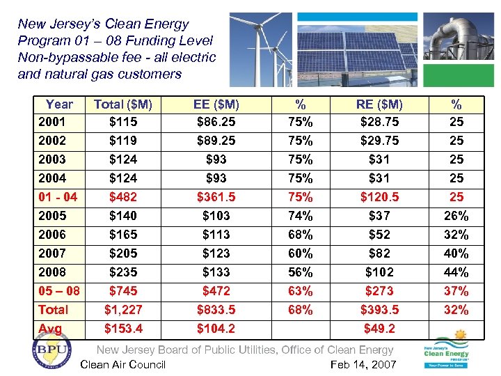 New Jersey’s Clean Energy Program 01 – 08 Funding Level Non-bypassable fee - all electric and natural gas customers Year 2001 2002 2003 2004 Total ($M) $115 $119 $124 EE ($M) $86. 25 $89. 25 $93 % 75% 75% RE ($M) $28. 75 $29. 75 $31 % 25 25 01 - 04 2005 2006 2007 2008 05 – 08 Total Avg $482 $140 $165 $205 $235 $745 $1, 227 $153. 4 $361. 5 $103 $113 $123 $133 $472 $833. 5 $104. 2 75% 74% 68% 60% 56% 63% 68% $120. 5 $37 $52 $82 $102 $273 $393. 5 $49. 2 25 26% 32% 40% 44% 37% 32% Clean Air Council Feb 14, 2007