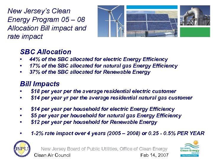 New Jersey’s Clean Energy Program 05 – 08 Allocation Bill impact and rate impact SBC Allocation • • • 44% of the SBC allocated for electric Energy Efficiency 17% of the SBC allocated for natural gas Energy Efficiency 37% of the SBC allocated for Renewable Energy Bill Impacts • • $18 per year per the average residential electric customer $14 per year yr per the average residential natural gas customer • • • $14 per year per household for electric Energy Efficiency $5 per year per household for natural gas Energy Efficiency $12 per year per household for Renewable Energy • 1 -2% rate impact over 4 years (2005 – 2008) or 0. 25 - 0. 5% PER YEAR Clean Air Council Feb 14, 2007