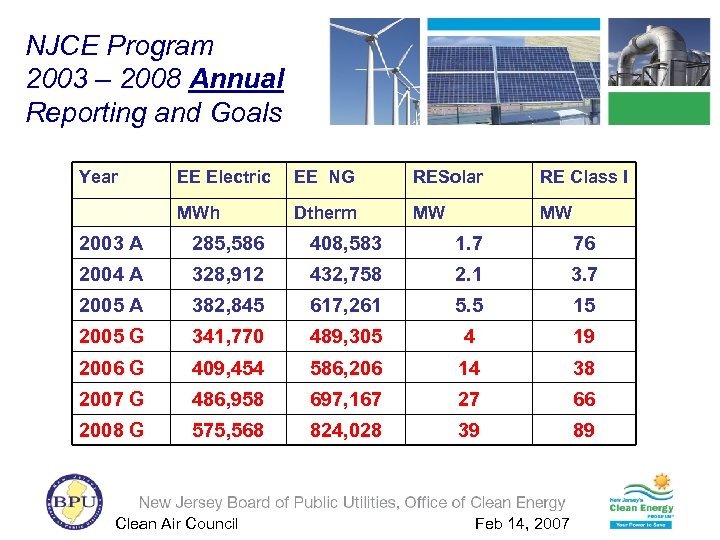 NJCE Program 2003 – 2008 Annual Reporting and Goals Year EE Electric EE NG RESolar RE Class I MWh Dtherm MW MW 2003 A 285, 586 408, 583 1. 7 76 2004 A 328, 912 432, 758 2. 1 3. 7 2005 A 382, 845 617, 261 5. 5 15 2005 G 341, 770 489, 305 4 19 2006 G 409, 454 586, 206 14 38 2007 G 486, 958 697, 167 27 66 2008 G 575, 568 824, 028 39 89 Clean Air Council Feb 14, 2007