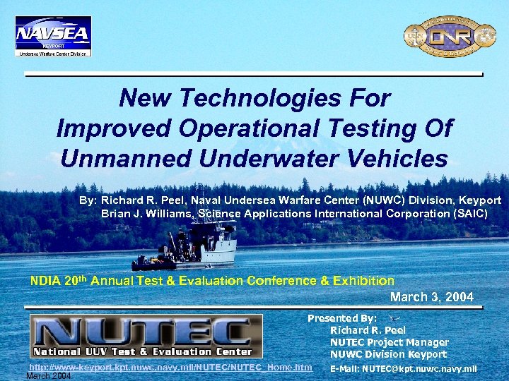New Technologies For Improved Operational Testing Of Unmanned Underwater Vehicles By: Richard R. Peel, Naval Undersea Warfare Center (NUWC) Division, Keyport Brian J. Williams, Science Applications International Corporation (SAIC) NDIA 20 th Annual Test & Evaluation Conference & Exhibition March 3, 2004 Naval Sea Systems Command Naval Undersea Warfare Center Presented By: Richard R. Peel NUTEC Project Manager NUWC Division Keyport http: //www-keyport. kpt. nuwc. navy. mil/NUTEC_Home. htm March 2004 E-Mail: NUTEC@kpt. nuwc. navy. mil