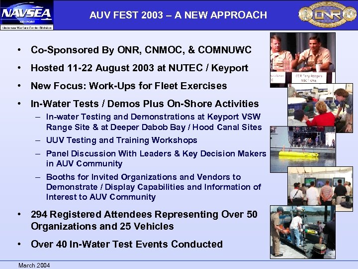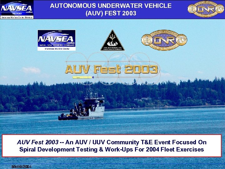 AUV FEST 2003 – A NEW APPROACH • Co-Sponsored By ONR, CNMOC, & COMNUWC • Hosted 11 -22 August 2003 at NUTEC / Keyport • New Focus: Work-Ups for Fleet Exercises • In-Water Tests / Demos Plus On-Shore Activities – In-water Testing and Demonstrations at Keyport VSW Range Site & at Deeper Dabob Bay / Hood Canal Sites – UUV Testing and Training Workshops – Panel Discussion With Leaders & Key Decision Makers in AUV Community – Booths for Invited Organizations and Vendors to Demonstrate / Display Capabilities and Information of Interest to AUV Community • 294 Registered Attendees Representing Over 50 Organizations and 25 Vehicles • Over 40 In-Water Test Events Conducted March 2004