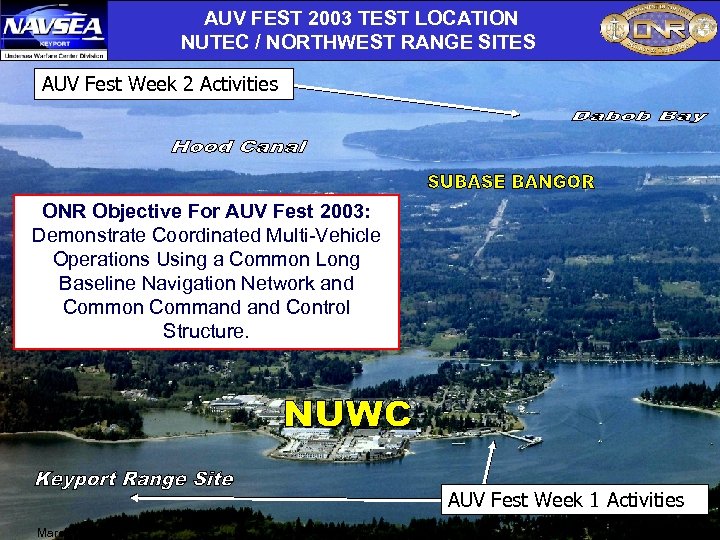 AUV FEST 2003 TEST LOCATION NUTEC / NORTHWEST RANGE SITES AUV Fest Week 2 Activities ONR Objective For AUV Fest 2003: Demonstrate Coordinated Multi-Vehicle Operations Using a Common Long Baseline Navigation Network and Common Command Control Structure. AUV Fest Week 1 Activities March 2004