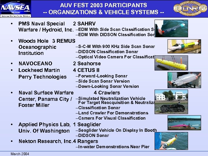AUV FEST 2003 PARTICIPANTS -- ORGANIZATIONS & VEHICLE SYSTEMS - • PMS Naval Special 2 SAHRV Warfare / Hydroid, Inc. –EDM With Side Scan Classification Sonar – EDM With DIDSON Classification Sonar • Woods Hole 3 REMUS – S-C-M With 900 KHz Side Scan Sonar Oceanographic – DIDSON Classification Sonar Institution – Optical Video Camera For Classification • • • NAVOCEANO Lockheed Martin Perry Technologies 2 Seahorse 4 CETUS II – Forward-Looking Sonar – Side Scan Sonar Version – Down-Looking Sonar Version Naval Surface Warfare 4 Crawlers Center, Panama City / –Simulated Neutralization Vehicle For Target Reacquisition & Neutralization Foster Miller – Classification Sonar – Land Crawler For Demonstrations – Camera For Visual Classification • Applied Physics Lab, 1 Seaglider Univ. Of Washington –Seaglider Vehicle On Display In Booth – DIDSON Sonar • Nekton Research, Inc. 4 Rangers – In-water Demonstrations Near Pier March 2004