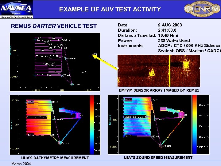 EXAMPLE OF AUV TEST ACTIVITY REMUS DARTER VEHICLE TEST Date: Duration: Distance Traveled: Power: Instruments: 9 AUG 2003 2: 41: 03. 8 10. 49 Nmi 238 Watts Used ADCP / CTD / 900 KHz Sidescan Seatech OBS / Modem / CADCA EMFVM SENSOR ARRAY IMAGED BY REMUS UUV’S BATHYMETRY MEASUREMENT March 2004 UUV’S SOUND SPEED MEASUREMENT