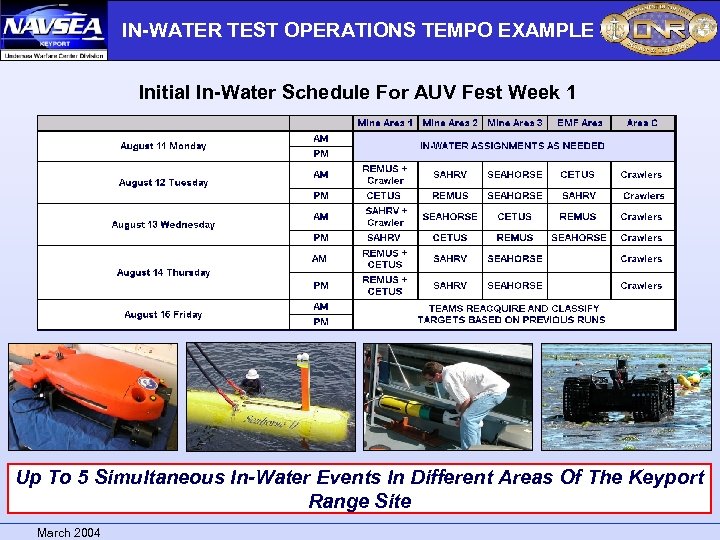 IN-WATER TEST OPERATIONS TEMPO EXAMPLE Initial In-Water Schedule For AUV Fest Week 1 Up To 5 Simultaneous In-Water Events In Different Areas Of The Keyport Range Site March 2004