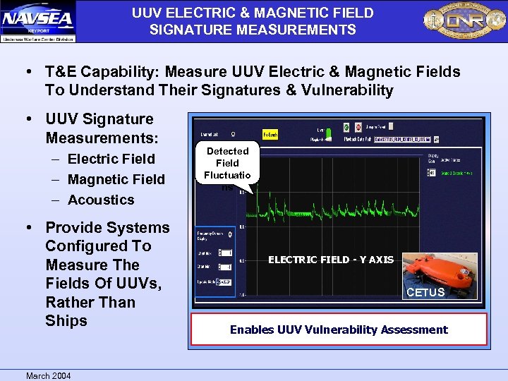 UUV ELECTRIC & MAGNETIC FIELD SIGNATURE MEASUREMENTS – Electric Field – Magnetic Field – Acoustics Detected Field Fluctuatio ns TIME System Upgrades Will Show 2 -D & 3 -D UUV Signatures FIELD STRENGTH • UUV Signature Measurements: FIELD STRENGTH • T&E Capability: Measure UUV Electric & Magnetic Fields To Understand Their Signatures & Vulnerability TIME • Provide Systems Configured To Measure The Fields Of UUVs, Rather Than Ships March 2004 ELECTRIC FIELD - Y AXIS CETUS Enables UUV Vulnerability Assessment