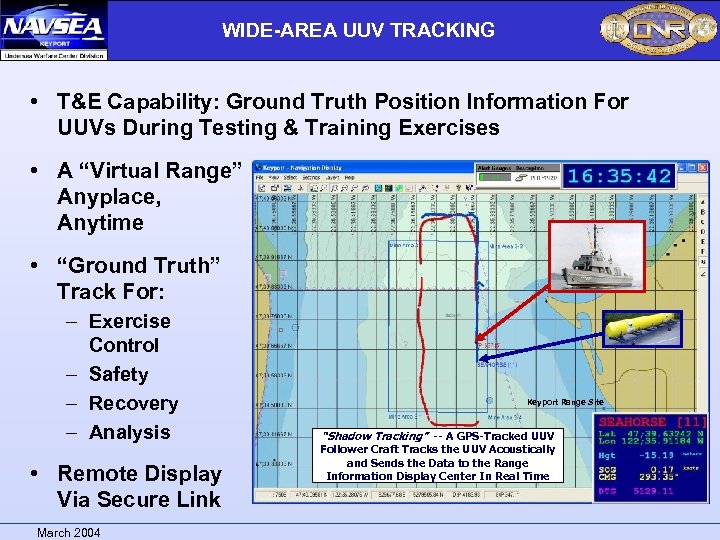 WIDE-AREA UUV TRACKING • T&E Capability: Ground Truth Position Information For UUVs During Testing & Training Exercises • A “Virtual Range” Anyplace, Anytime • “Ground Truth” Track For: – Exercise Control – Safety – Recovery – Analysis • Remote Display Via Secure Link March 2004 Keyport Range Site “Shadow Tracking” -- A GPS-Tracked UUV Follower Craft Tracks the UUV Acoustically and Sends the Data to the Range Enables Test Control, Safety, Efficiency, Information Display Center In Real Time Recovery, Better/Faster Analyses, & More Meaningful Results