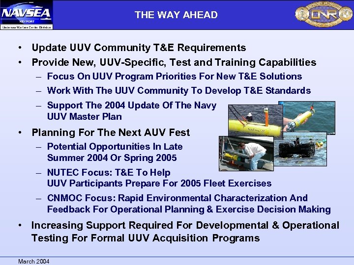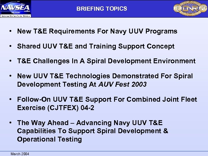 BRIEFING TOPICS • New T&E Requirements For Navy UUV Programs • Shared UUV T&E and Training Support Concept • T&E Challenges In A Spiral Development Environment • New UUV T&E Technologies Demonstrated For Spiral Development Testing At AUV Fest 2003 • Follow-On UUV T&E Support For Combined Joint Fleet Exercise (CJTFEX) 04 -2 • The Way Ahead – Advancing Navy UUV T&E Capabilities To Support Spiral Development & Operational Testing March 2004