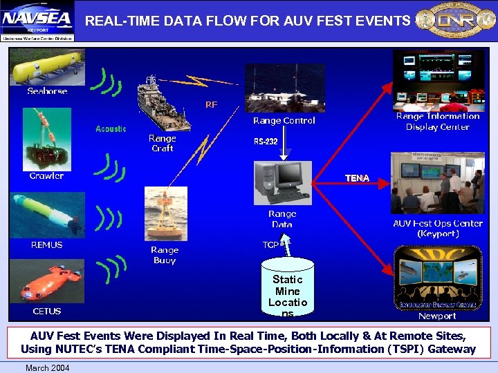 REAL-TIME DATA FLOW FOR AUV FEST EVENTS TENA Static Mine Locatio ns AUV Fest Events Were Displayed In Real Time, Both Locally & At Remote Sites, Using NUTEC’s TENA Compliant Time-Space-Position-Information (TSPI) Gateway March 2004
