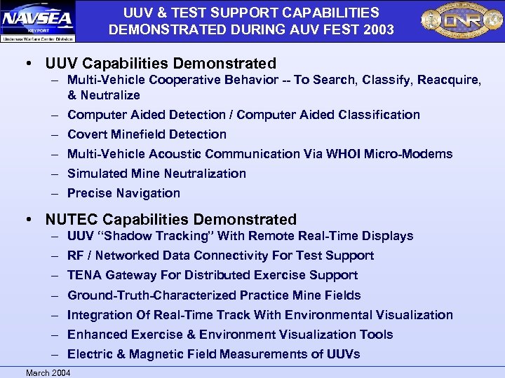 UUV & TEST SUPPORT CAPABILITIES DEMONSTRATED DURING AUV FEST 2003 • UUV Capabilities Demonstrated – Multi-Vehicle Cooperative Behavior -- To Search, Classify, Reacquire, & Neutralize – Computer Aided Detection / Computer Aided Classification – Covert Minefield Detection – Multi-Vehicle Acoustic Communication Via WHOI Micro-Modems – Simulated Mine Neutralization – Precise Navigation • NUTEC Capabilities Demonstrated – UUV “Shadow Tracking” With Remote Real-Time Displays – RF / Networked Data Connectivity For Test Support – TENA Gateway For Distributed Exercise Support – Ground-Truth-Characterized Practice Mine Fields – Integration Of Real-Time Track With Environmental Visualization – Enhanced Exercise & Environment Visualization Tools – Electric & Magnetic Field Measurements of UUVs March 2004