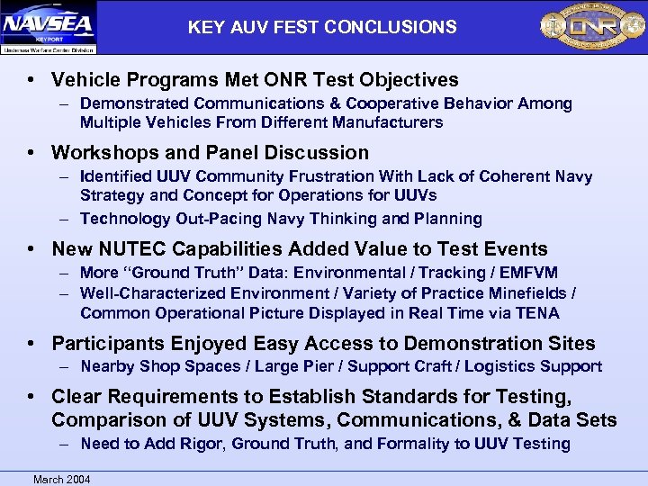KEY AUV FEST CONCLUSIONS • Vehicle Programs Met ONR Test Objectives – Demonstrated Communications & Cooperative Behavior Among Multiple Vehicles From Different Manufacturers • Workshops and Panel Discussion – Identified UUV Community Frustration With Lack of Coherent Navy Strategy and Concept for Operations for UUVs – Technology Out-Pacing Navy Thinking and Planning • New NUTEC Capabilities Added Value to Test Events – More “Ground Truth” Data: Environmental / Tracking / EMFVM – Well-Characterized Environment / Variety of Practice Minefields / Common Operational Picture Displayed in Real Time via TENA • Participants Enjoyed Easy Access to Demonstration Sites – Nearby Shop Spaces / Large Pier / Support Craft / Logistics Support • Clear Requirements to Establish Standards for Testing, Comparison of UUV Systems, Communications, & Data Sets – Need to Add Rigor, Ground Truth, and Formality to UUV Testing March 2004