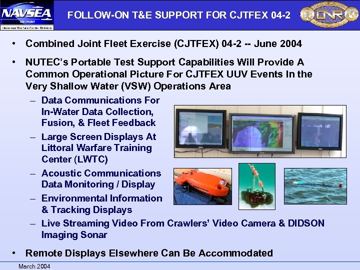 FOLLOW-ON T&E SUPPORT FOR CJTFEX 04 -2 • Combined Joint Fleet Exercise (CJTFEX) 04 -2 -- June 2004 • NUTEC’s Portable Test Support Capabilities Will Provide A Common Operational Picture For CJTFEX UUV Events In the Very Shallow Water (VSW) Operations Area – Data Communications For – – In-Water Data Collection, Fusion, & Fleet Feedback Large Screen Displays At Littoral Warfare Training Center (LWTC) Acoustic Communications Data Monitoring / Display Environmental Information & Tracking Displays Live Streaming Video From Crawlers’ Video Camera & DIDSON Imaging Sonar • Remote Displays Elsewhere Can Be Accommodated March 2004