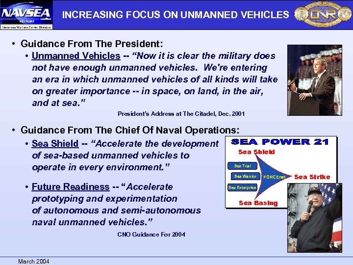 INCREASING FOCUS ON UNMANNED VEHICLES • Guidance From The President: • Unmanned Vehicles -- “Now it is clear the military does not have enough unmanned vehicles. We're entering an era in which unmanned vehicles of all kinds will take on greater importance -- in space, on land, in the air, and at sea. ” President’s Address at The Citadel, Dec. 2001 • Guidance From The Chief Of Naval Operations: • Sea Shield -- “Accelerate the development Sea Shield of sea-based unmanned vehicles to Sea Trial operate in every environment. ” Sea Warrior FORCEnet Sea Strike Sea Enterprise • Future Readiness -- “Accelerate prototyping and experimentation Sea Basing of autonomous and semi-autonomous naval unmanned vehicles. ” CNO Guidance For 2004 March 2004