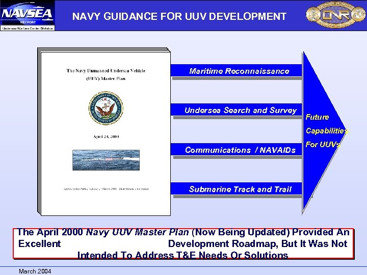 NAVY GUIDANCE FOR UUV DEVELOPMENT Maritime Reconnaissance Undersea Search and Survey Future Capabilities Communications / NAVAIDs For UUVs Submarine Track and Trail The April 2000 Navy UUV Master Plan (Now Being Updated) Provided An Excellent Development Roadmap, But It Was Not Intended To Address T&E Needs Or Solutions March 2004