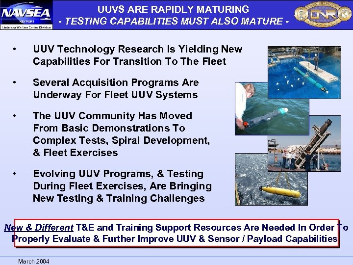 UUVS ARE RAPIDLY MATURING - TESTING CAPABILITIES MUST ALSO MATURE - • UUV Technology Research Is Yielding New Capabilities For Transition To The Fleet • Several Acquisition Programs Are Underway For Fleet UUV Systems • The UUV Community Has Moved From Basic Demonstrations To Complex Tests, Spiral Development, & Fleet Exercises • Evolving UUV Programs, & Testing During Fleet Exercises, Are Bringing New Testing & Training Challenges New & Different T&E and Training Support Resources Are Needed In Order To Properly Evaluate & Further Improve UUV & Sensor / Payload Capabilities March 2004