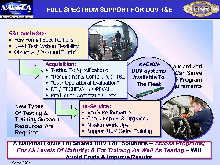 FULL SPECTRUM SUPPORT FOR UUV T&E S&T and R&D: • Few Formal Specifications • Need Test System Flexibility • Objective / “Ground Truth” Acquisition: • Testing To Specifications • “Requirements Compliance” T&E • “User Operational Evaluation” • DT / TECHEVAL / OPEVAL • Production Acceptance Tests New Types Of Testing & Training Support Resources Are Required Reliable Shared, Standardized UUV Systems Resources Can Serve Available Multiple Program To The Fleet Requirements In-Service: • Verify Performance • Check Repairs & Upgrades • Mission Work-Ups • Support UUV Cadre Training A National Focus For Shared UUV T&E Solutions – Across Programs; For All Levels Of Maturity; & For Training As Well As Testing – Will Avoid Costs & Improve Results March 2004