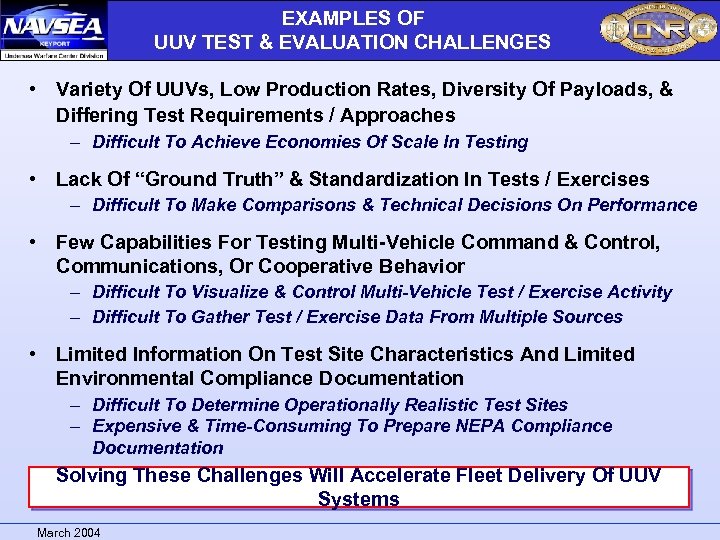 EXAMPLES OF UUV TEST & EVALUATION CHALLENGES • Variety Of UUVs, Low Production Rates, Diversity Of Payloads, & Differing Test Requirements / Approaches – Difficult To Achieve Economies Of Scale In Testing • Lack Of “Ground Truth” & Standardization In Tests / Exercises – Difficult To Make Comparisons & Technical Decisions On Performance • Few Capabilities For Testing Multi-Vehicle Command & Control, Communications, Or Cooperative Behavior – Difficult To Visualize & Control Multi-Vehicle Test / Exercise Activity – Difficult To Gather Test / Exercise Data From Multiple Sources • Limited Information On Test Site Characteristics And Limited Environmental Compliance Documentation – Difficult To Determine Operationally Realistic Test Sites – Expensive & Time-Consuming To Prepare NEPA Compliance Documentation Solving These Challenges Will Accelerate Fleet Delivery Of UUV Systems March 2004