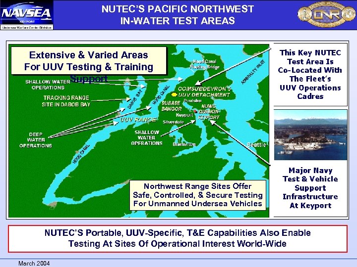 NUTEC’S PACIFIC NORTHWEST IN-WATER TEST AREAS Extensive & Varied Areas For UUV Testing & Training Support Northwest Range Sites Offer Safe, Controlled, & Secure Testing For Unmanned Undersea Vehicles NUTEC’S Portable, UUV-Specific, T&E Capabilities Also Enable Testing At Sites Of Operational Interest World-Wide March 2004