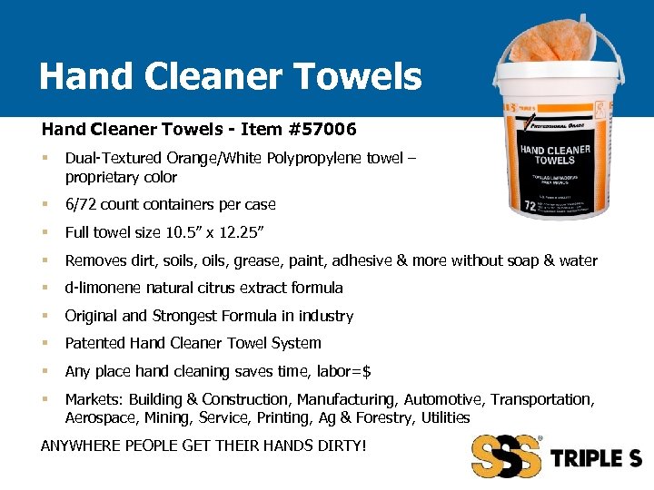 Hand Cleaner Towels - Item #57006 § Dual-Textured Orange/White Polypropylene towel – proprietary color § 6/72 count containers per case § Full towel size 10. 5” x 12. 25” § Removes dirt, soils, grease, paint, adhesive & more without soap & water § d-limonene natural citrus extract formula § Original and Strongest Formula in industry § Patented Hand Cleaner Towel System § Any place hand cleaning saves time, labor=$ § Markets: Building & Construction, Manufacturing, Automotive, Transportation, Aerospace, Mining, Service, Printing, Ag & Forestry, Utilities ANYWHERE PEOPLE GET THEIR HANDS DIRTY!