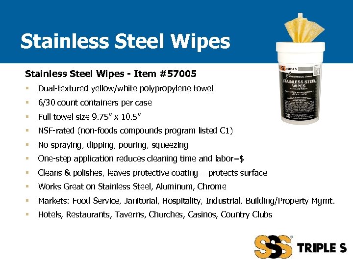 Stainless Steel Wipes - Item #57005 § Dual-textured yellow/white polypropylene towel § 6/30 count containers per case § Full towel size 9. 75” x 10. 5” § NSF-rated (non-foods compounds program listed C 1) § No spraying, dipping, pouring, squeezing § One-step application reduces cleaning time and labor=$ § Cleans & polishes, leaves protective coating – protects surface § Works Great on Stainless Steel, Aluminum, Chrome § Markets: Food Service, Janitorial, Hospitality, Industrial, Building/Property Mgmt. § Hotels, Restaurants, Taverns, Churches, Casinos, Country Clubs