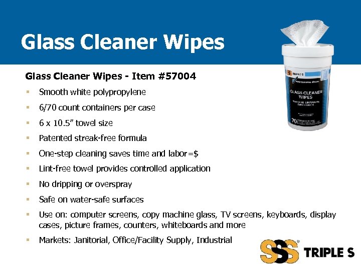 Glass Cleaner Wipes - Item #57004 § Smooth white polypropylene § 6/70 count containers per case § 6 x 10. 5” towel size § Patented streak-free formula § One-step cleaning saves time and labor=$ § Lint-free towel provides controlled application § No dripping or overspray § Safe on water-safe surfaces § Use on: computer screens, copy machine glass, TV screens, keyboards, display cases, picture frames, counters, whiteboards and more § Markets: Janitorial, Office/Facility Supply, Industrial