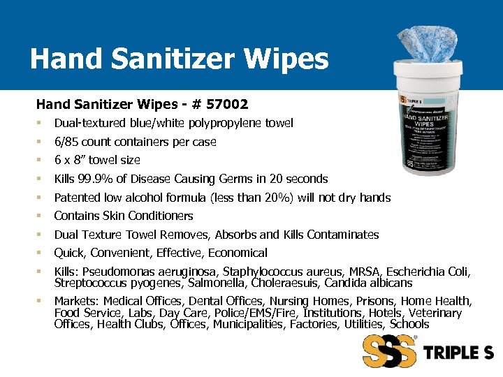 Hand Sanitizer Wipes - # 57002 § Dual-textured blue/white polypropylene towel § 6/85 count containers per case § 6 x 8” towel size § Kills 99. 9% of Disease Causing Germs in 20 seconds § Patented low alcohol formula (less than 20%) will not dry hands § Contains Skin Conditioners § Dual Texture Towel Removes, Absorbs and Kills Contaminates § Quick, Convenient, Effective, Economical § Kills: Pseudomonas aeruginosa, Staphylococcus aureus, MRSA, Escherichia Coli, Streptococcus pyogenes, Salmonella, Choleraesuis, Candida albicans § Markets: Medical Offices, Dental Offices, Nursing Homes, Prisons, Home Health, Food Service, Labs, Day Care, Police/EMS/Fire, Institutions, Hotels, Veterinary Offices, Health Clubs, Offices, Municipalities, Factories, Utilities, Schools