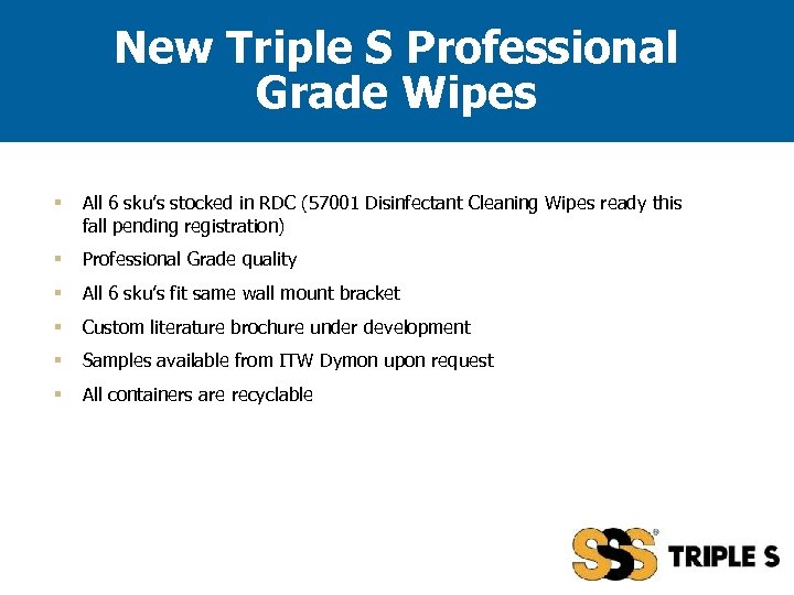 New Triple S Professional Grade Wipes § All 6 sku’s stocked in RDC (57001 Disinfectant Cleaning Wipes ready this fall pending registration) § Professional Grade quality § All 6 sku’s fit same wall mount bracket § Custom literature brochure under development § Samples available from ITW Dymon upon request § All containers are recyclable