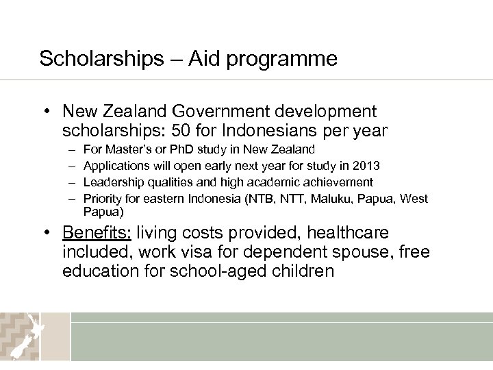 Scholarships – Aid programme • New Zealand Government development scholarships: 50 for Indonesians per year – – For Master’s or Ph. D study in New Zealand Applications will open early next year for study in 2013 Leadership qualities and high academic achievement Priority for eastern Indonesia (NTB, NTT, Maluku, Papua, West Papua) • Benefits: living costs provided, healthcare included, work visa for dependent spouse, free education for school-aged children