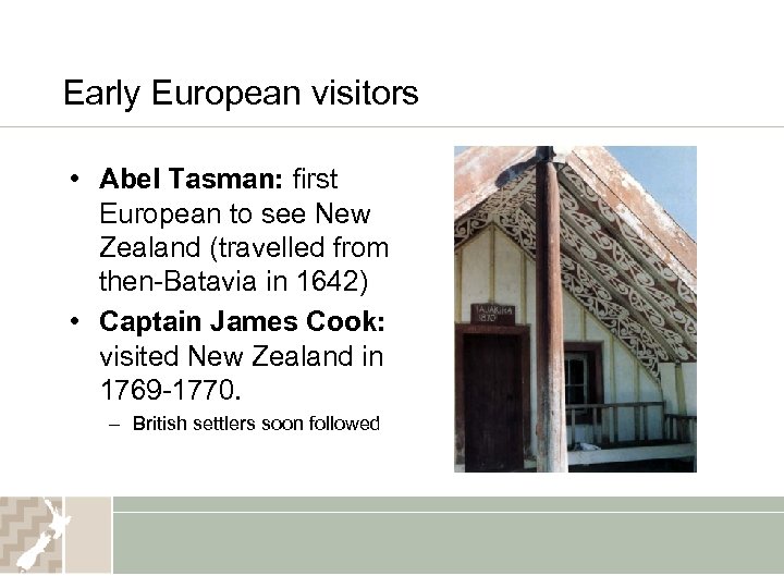 Early European visitors • Abel Tasman: first European to see New Zealand (travelled from then-Batavia in 1642) • Captain James Cook: visited New Zealand in 1769 -1770. – British settlers soon followed