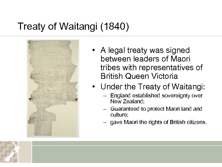 Treaty of Waitangi (1840) • A legal treaty was signed between leaders of Maori tribes with representatives of British Queen Victoria • Under the Treaty of Waitangi: – England established sovereignty over New Zealand; – Guaranteed to protect Maori land culture; – gave Maori the rights of British citizens.