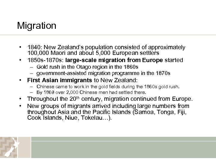 Migration • 1840: New Zealand’s population consisted of approximately 100, 000 Maori and about 5, 000 European settlers • 1850 s-1870 s: large-scale migration from Europe started – Gold rush in the Otago region in the 1860 s – government-assisted migration programme in the 1870 s • First Asian immigrants to New Zealand: – Chinese came to work in the gold fields during the 1860 s gold rush. – By 1869 over 2, 000 Chinese men had settled there. • Throughout the 20 th century, migration continued from Europe. • New groups of migrants arrived including large numbers from throughout Asia and the Pacific Islands (Samoa, Tonga, Fiji, Cook Islands, Niue, Tokelau…).