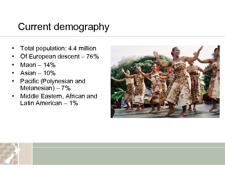 Current demography • • • Total population: 4. 4 million Of European descent – 76% Maori – 14% Asian – 10% Pacific (Polynesian and Melanesian) – 7% • Middle Eastern, African and Latin American – 1%
