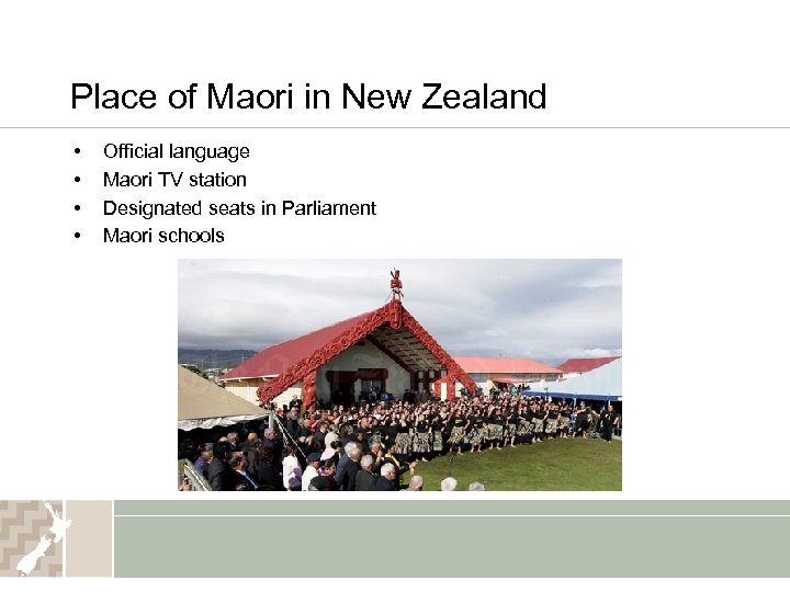 Place of Maori in New Zealand • • Official language Maori TV station Designated seats in Parliament Maori schools