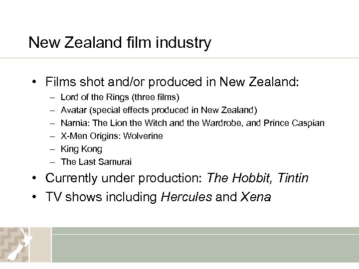 New Zealand film industry • Films shot and/or produced in New Zealand: – – – Lord of the Rings (three films) Avatar (special effects produced in New Zealand) Narnia: The Lion the Witch and the Wardrobe, and Prince Caspian X-Men Origins: Wolverine King Kong The Last Samurai • Currently under production: The Hobbit, Tintin • TV shows including Hercules and Xena