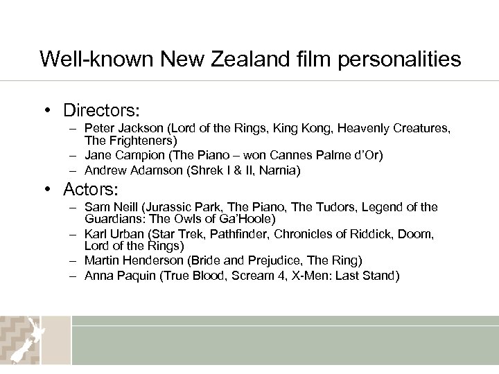 Well-known New Zealand film personalities • Directors: – Peter Jackson (Lord of the Rings, King Kong, Heavenly Creatures, The Frighteners) – Jane Campion (The Piano – won Cannes Palme d’Or) – Andrew Adamson (Shrek I & II, Narnia) • Actors: – Sam Neill (Jurassic Park, The Piano, The Tudors, Legend of the Guardians: The Owls of Ga’Hoole) – Karl Urban (Star Trek, Pathfinder, Chronicles of Riddick, Doom, Lord of the Rings) – Martin Henderson (Bride and Prejudice, The Ring) – Anna Paquin (True Blood, Scream 4, X-Men: Last Stand)