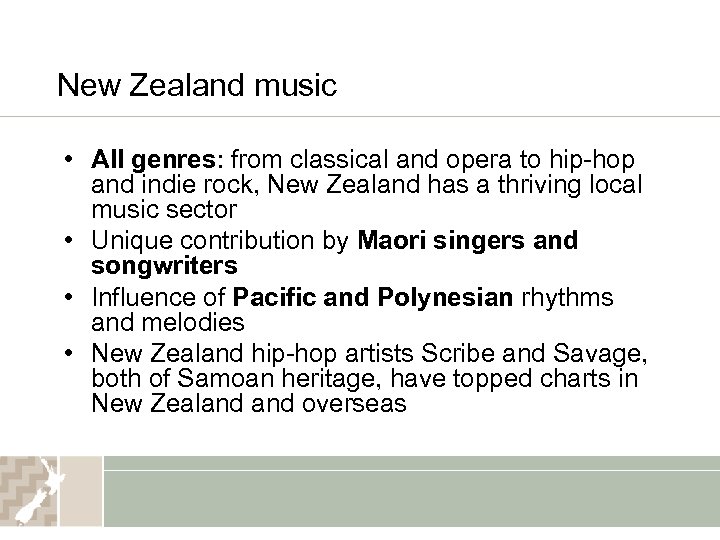 New Zealand music • All genres: from classical and opera to hip-hop and indie rock, New Zealand has a thriving local music sector • Unique contribution by Maori singers and songwriters • Influence of Pacific and Polynesian rhythms and melodies • New Zealand hip-hop artists Scribe and Savage, both of Samoan heritage, have topped charts in New Zealand overseas