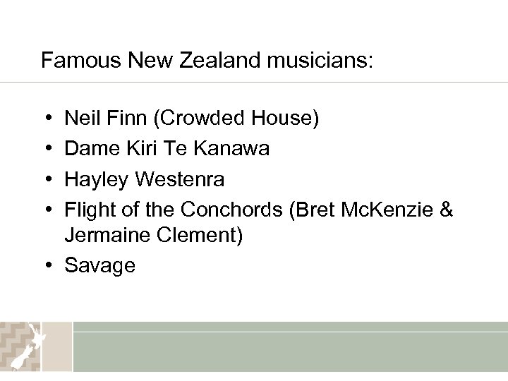 Famous New Zealand musicians: • • Neil Finn (Crowded House) Dame Kiri Te Kanawa Hayley Westenra Flight of the Conchords (Bret Mc. Kenzie & Jermaine Clement) • Savage