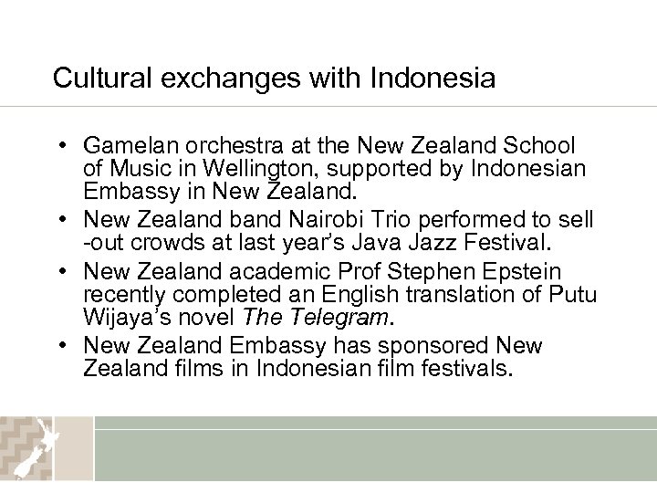 Cultural exchanges with Indonesia • Gamelan orchestra at the New Zealand School of Music in Wellington, supported by Indonesian Embassy in New Zealand. • New Zealand band Nairobi Trio performed to sell -out crowds at last year’s Java Jazz Festival. • New Zealand academic Prof Stephen Epstein recently completed an English translation of Putu Wijaya’s novel The Telegram. • New Zealand Embassy has sponsored New Zealand films in Indonesian film festivals.