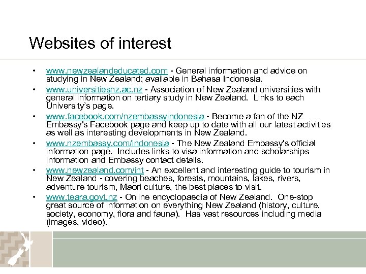 Websites of interest • • • www. newzealandeducated. com - General information and advice on studying in New Zealand; available in Bahasa Indonesia. www. universitiesnz. ac. nz - Association of New Zealand universities with general information on tertiary study in New Zealand. Links to each University’s page. www. facebook. com/nzembassyindonesia - Become a fan of the NZ Embassy's Facebook page and keep up to date with all our latest activities as well as interesting developments in New Zealand. www. nzembassy. com/indonesia - The New Zealand Embassy's official information page. Includes links to visa information and scholarships information and Embassy contact details. www. newzealand. com/int - An excellent and interesting guide to tourism in New Zealand - covering beaches, forests, mountains, lakes, rivers, adventure tourism, Maori culture, the best places to visit. www. teara. govt. nz - Online encyclopaedia of New Zealand. One-stop great source of information on everything New Zealand (history, culture, society, economy, flora and fauna). Has vast resources including media (images, video).