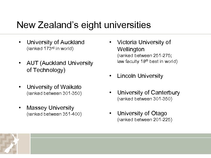 New Zealand’s eight universities • University of Auckland (ranked 173 rd in world) • AUT (Auckland University of Technology) • University of Waikato (ranked between 301 -350) • Victoria University of Wellington (ranked between 251 -275; law faculty 19 th best in world) • Lincoln University • University of Canterbury (ranked between 301 -350) • Massey University (ranked between 351 -400) • University of Otago (ranked between 201 -225)