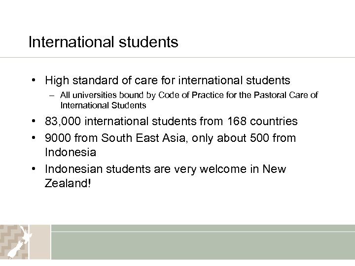 International students • High standard of care for international students – All universities bound by Code of Practice for the Pastoral Care of International Students • 83, 000 international students from 168 countries • 9000 from South East Asia, only about 500 from Indonesia • Indonesian students are very welcome in New Zealand!