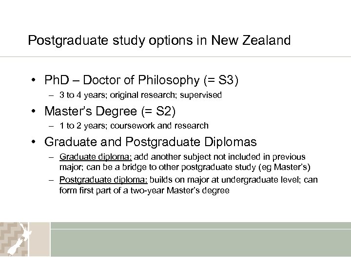 Postgraduate study options in New Zealand • Ph. D – Doctor of Philosophy (= S 3) – 3 to 4 years; original research; supervised • Master’s Degree (= S 2) – 1 to 2 years; coursework and research • Graduate and Postgraduate Diplomas – Graduate diploma: add another subject not included in previous major; can be a bridge to other postgraduate study (eg Master’s) – Postgraduate diploma: builds on major at undergraduate level; can form first part of a two-year Master’s degree