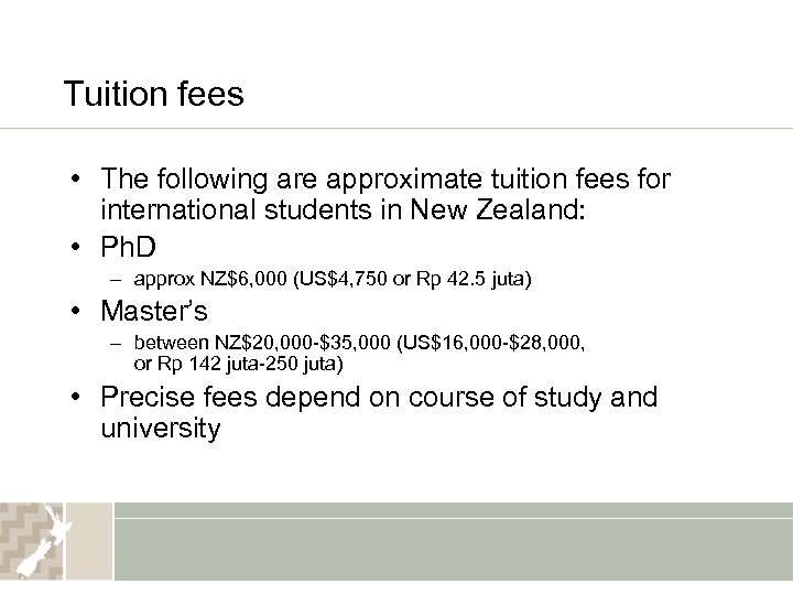 Tuition fees • The following are approximate tuition fees for international students in New Zealand: • Ph. D – approx NZ$6, 000 (US$4, 750 or Rp 42. 5 juta) • Master’s – between NZ$20, 000 -$35, 000 (US$16, 000 -$28, 000, or Rp 142 juta-250 juta) • Precise fees depend on course of study and university
