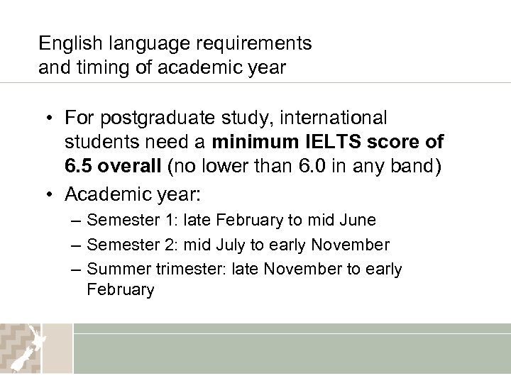 English language requirements and timing of academic year • For postgraduate study, international students need a minimum IELTS score of 6. 5 overall (no lower than 6. 0 in any band) • Academic year: – Semester 1: late February to mid June – Semester 2: mid July to early November – Summer trimester: late November to early February