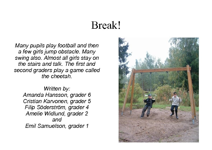Break! Many pupils play football and then a few girls jump obstacle. Many swing also. Almost all girls stay on the stairs and talk. The first and second graders play a game called the cheetah. Written by: Amanda Hansson, grader 6 Cristian Karvonen, grader 5 Filip Söderström, grader 4 Amelie Widlund, grader 2 and Emil Samuelson, grader 1