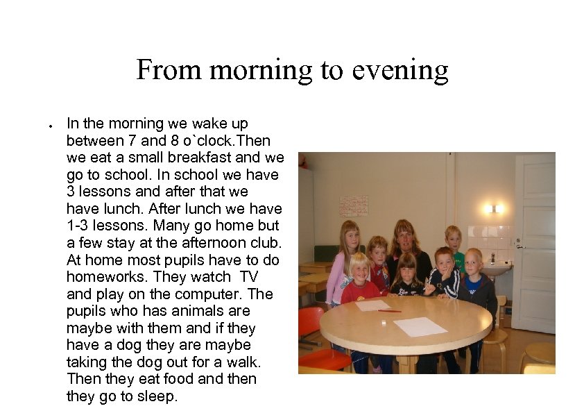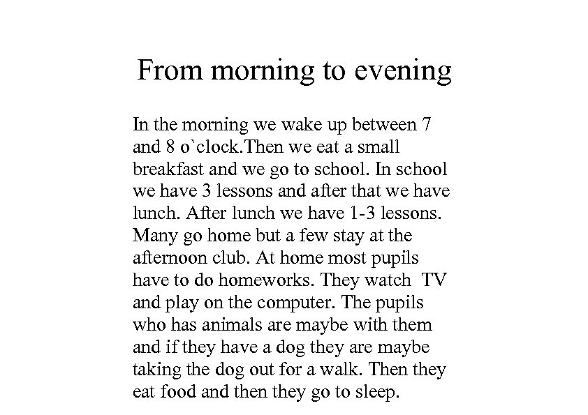 From morning to evening In the morning we wake up between 7 and 8 o`clock. Then we eat a small breakfast and we go to school. In school we have 3 lessons and after that we have lunch. After lunch we have 1 -3 lessons. Many go home but a few stay at the afternoon club. At home most pupils have to do homeworks. They watch TV and play on the computer. The pupils who has animals are maybe with them and if they have a dog they are maybe taking the dog out for a walk. Then they eat food and then they go to sleep.
